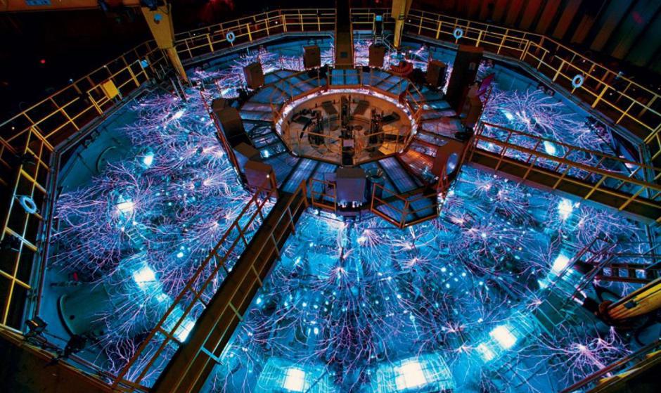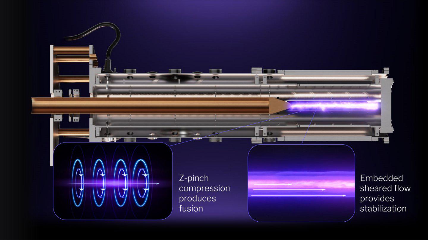 A schematic of the Fusion Z-pinch Experiment device concept where a plasma is compressed to fusion conditions through a Z pinch and stabilized with plasma flow.